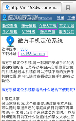 方法二:在被定位手机上使用浏览器打开网站 158dw.com,点击“介绍&下载”进入下载内面,直接下载到手机上进行安装,如下图所示: