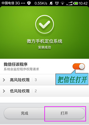首先在被查看手机上安装我们的“微方手机定位软件”,安装结束时请选择信任程序并且点击打开,方法如下: